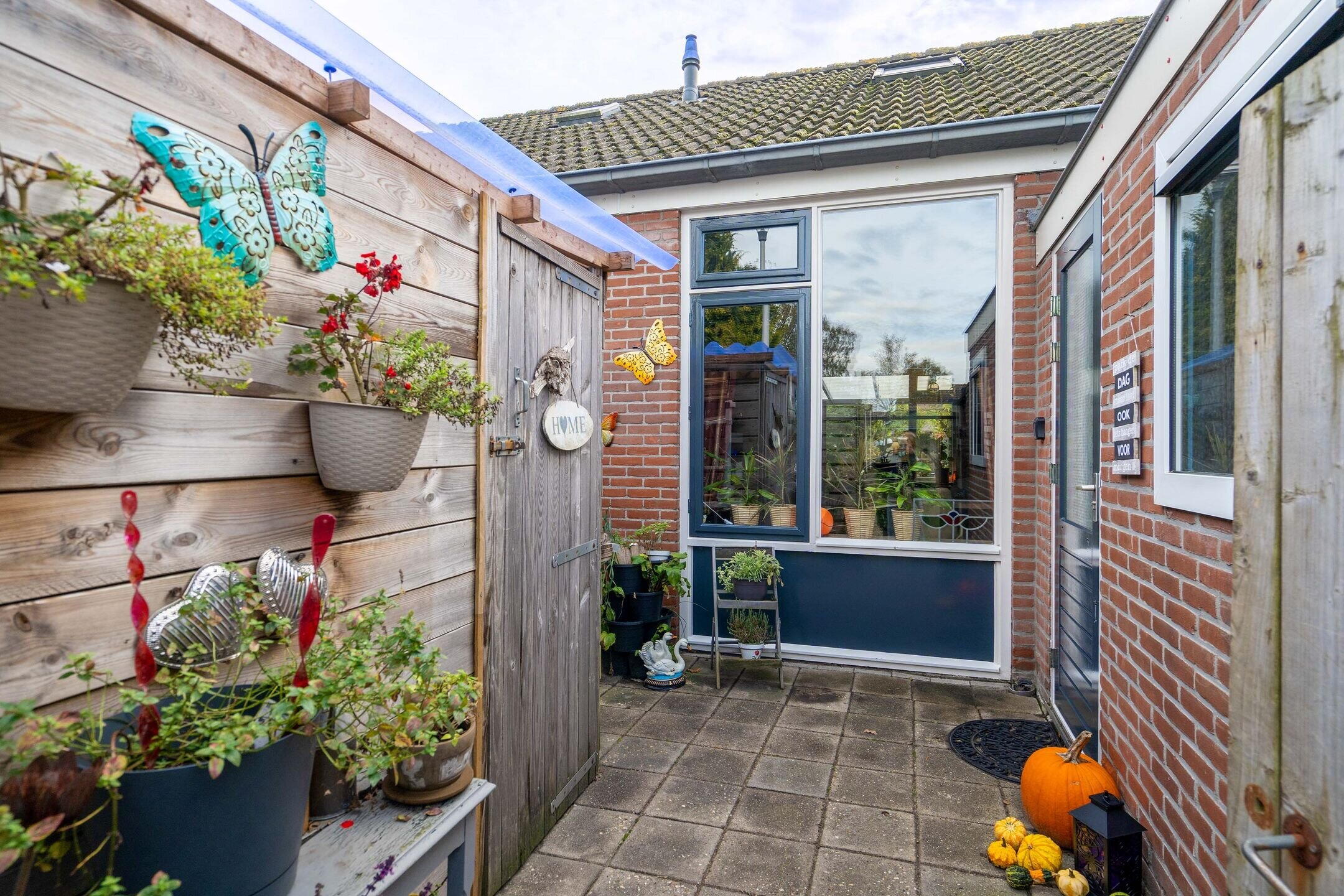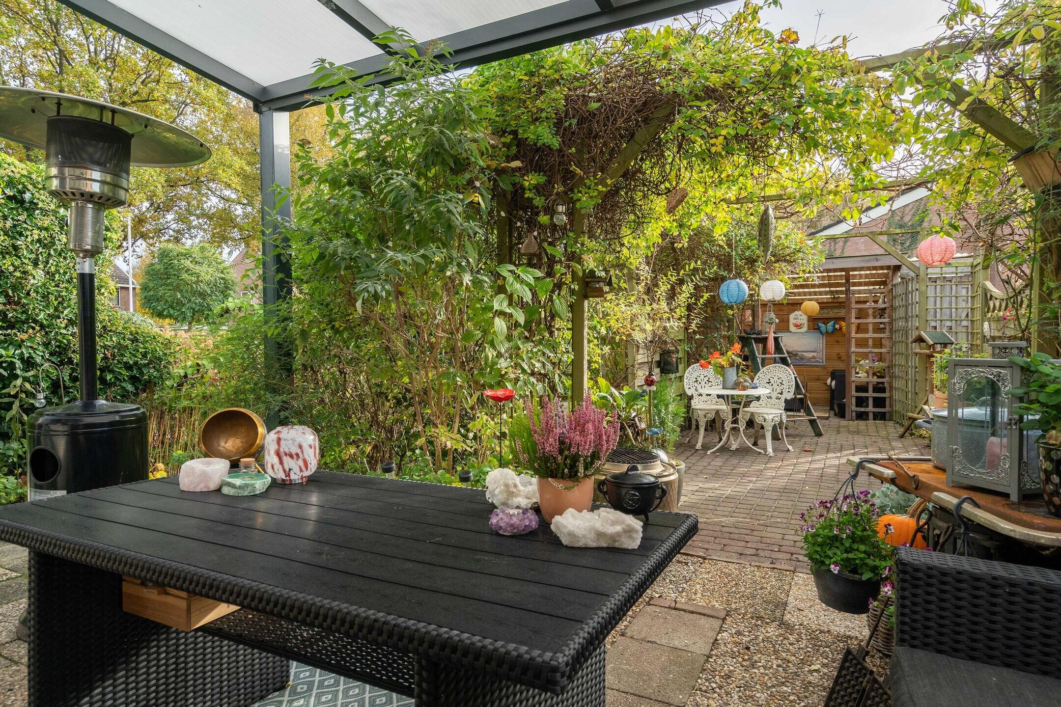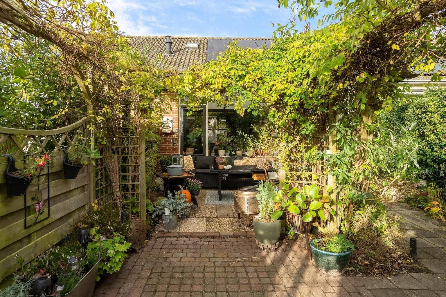 De voor- en achtertuin bieden meerdere fijne zitplekken. Het overkapte, bloemrijke prieel in de voortuin is een echte blikvanger en biedt een beschutte plek om te genieten van lange zomeravonden. Ook aan de achterzijde is een besloten tuin met achterom.